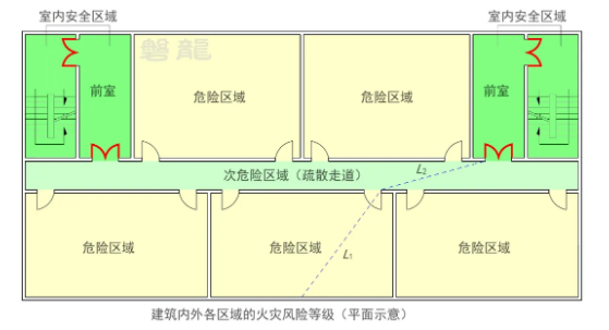 (2)次危险区域(走道)的疏散距离:从房间疏散门至最近安全出口的直线距离(L2)。