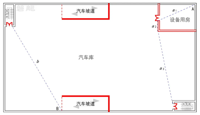 示例:【图示9】所示的汽车库,A点至最近安全出口的距离为a1+a2+a3,B点至最近安全出口的距离为b。