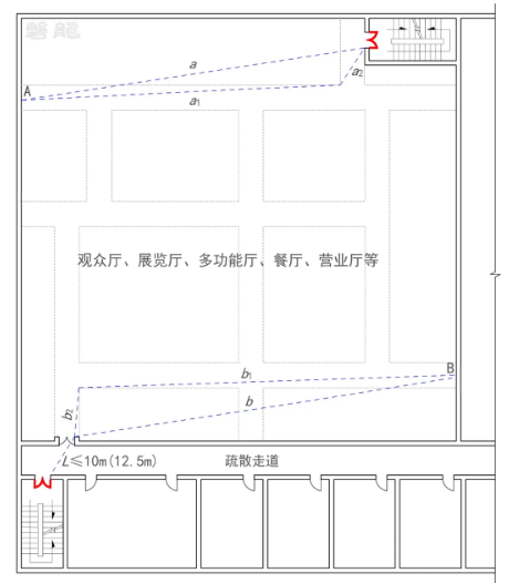 【图示10】中:A点至疏散出口的直线距离(a)不得超过30m(37.5m),行走距离(a1+a2)不得超过45m; B点至疏散出口的直线距离(b)不得超过30m(37.5m),行走距离(b1+b2)不得超过45m。