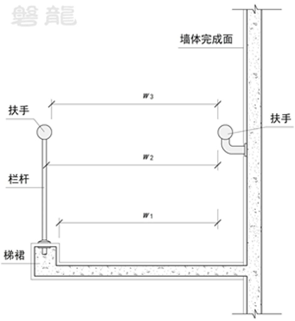【图示7】为两侧设置扶手的楼梯梯段,净宽度应取w1、w2、w3最小值。