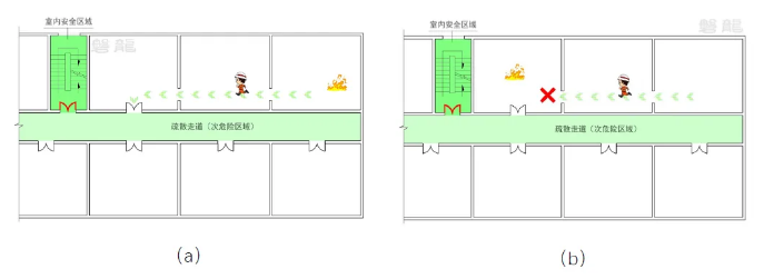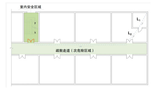 室内房间属于危险区域,一旦发生火灾,人员应迅速疏散至相对安全的次危险区域(疏散走道),通过疏散走道疏散至安全出口【图示1】。