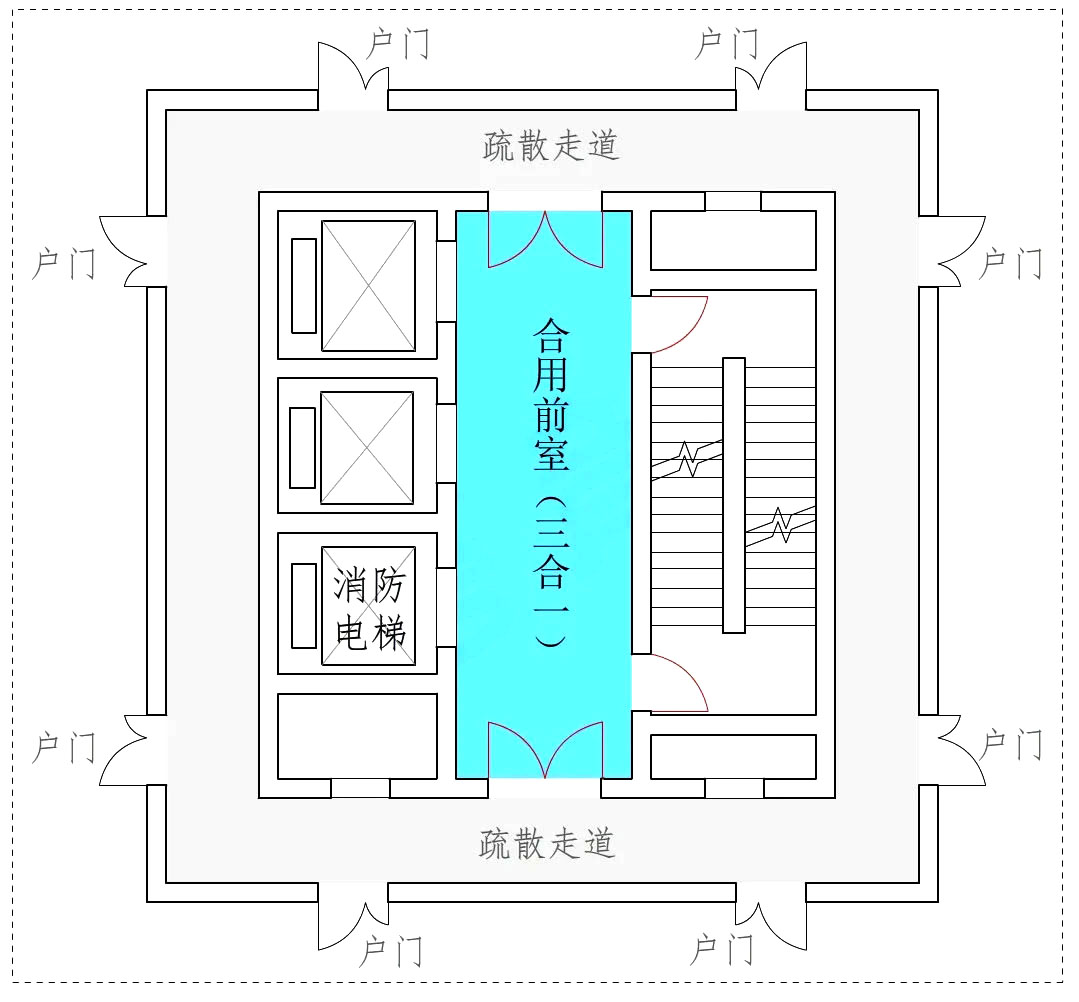 消防电梯合用前室是指防烟楼梯间前室与消防电梯前室合用(图示1),是目前消防电梯前室的主流形式,其中包括楼梯间的共用前室与消防电梯的前室合用(俗称三合一前室)(图示2)。