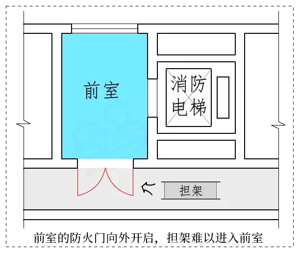 如防火门向疏散走道开启,抬负伤员的担架是很难进入消防电梯前室的,就算第三人协助也会有一定困难,因此,防火门必须向前室内部开启。(图示4)