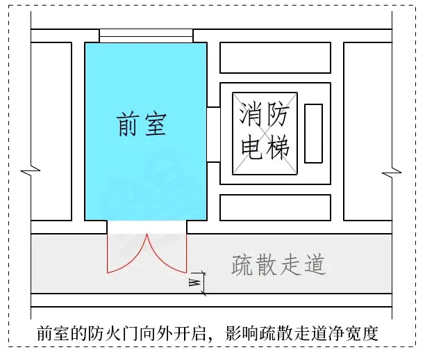 消防电梯前室的防火门,如向疏散走道方向开启,将直接影响疏散走道的净宽度,对安全疏散造成不利影响。图示5中,防火门开启后,疏散走道净宽度W不能满足疏散要求。